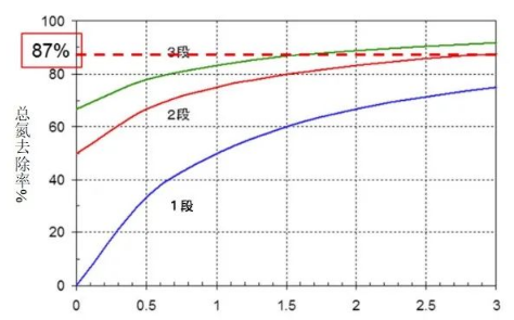 ▲不同段數(shù)A/O工藝的總氮去除率對比