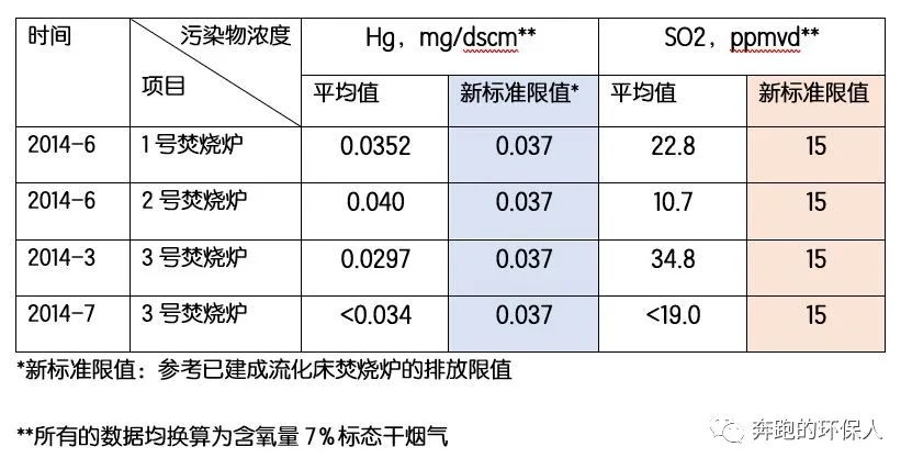 2014年的煙氣排放檢測(cè)數(shù)據(jù)顯示,煙氣中的污染物主要是汞和SO2無(wú)法滿足2016年生效的新標(biāo)準(zhǔn)排放限值,以下每個(gè)數(shù)據(jù)都是三次測(cè)試的平均值: