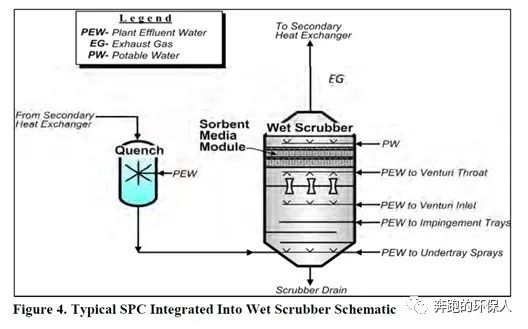 3.SPC吸附技術(shù),Sorbent Polymer Composite,一種利用特殊吸附材料的新型專利汞去除技術(shù)。其可以單獨(dú)作為一個(gè)裝置使用,也可以改造已有的濕式洗滌塔,將其作為濕式洗滌塔的一部分來(lái)使用。該系統(tǒng)采用了由SPC濾料組成的專用濾料床,可從污泥焚燒廢氣中捕獲離子態(tài)和元素態(tài)的汞。