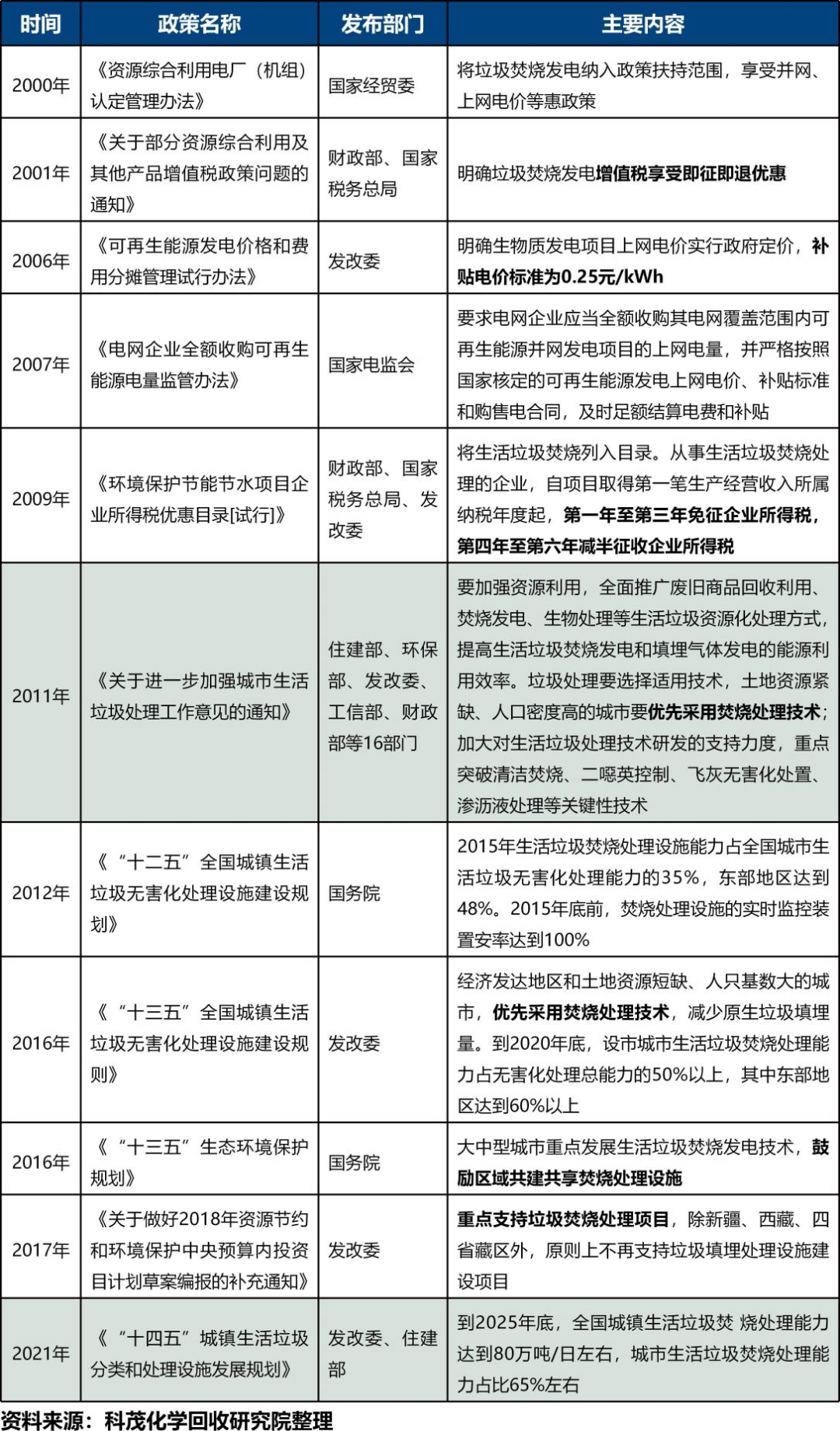 表5  垃圾焚燒發(fā)電行業(yè)部分政策鼓勵