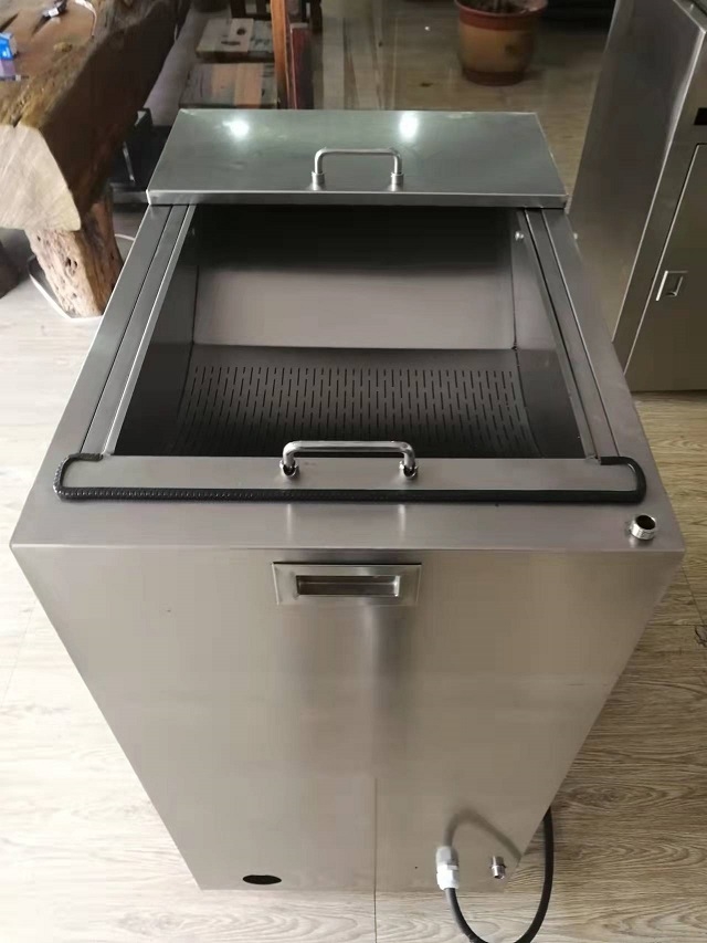 據(jù)介紹,餐廚垃圾綜合處理一體機由機體、固液分離料斗、油水分離構、粉碎研磨機構、配電箱等組成。餐廚垃圾先經過固液分離程序,分為固態(tài)材料和液體兩部分;隨后,固態(tài)材料通過粉碎研磨排入垃圾桶,液體通過油水分離被分成污水、廢油兩部分。