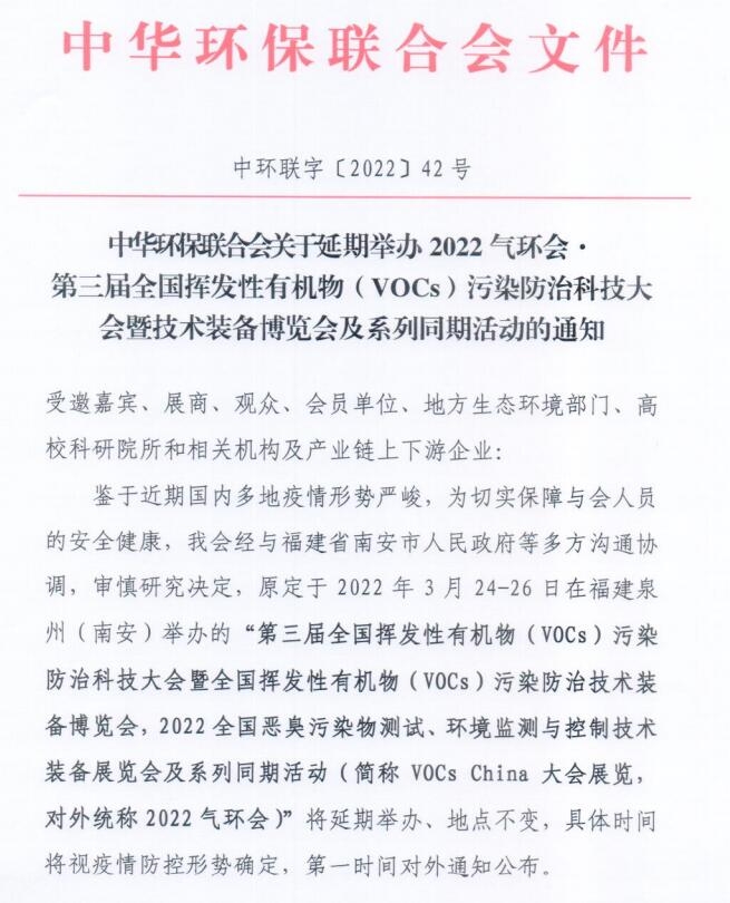 中華環(huán)保聯(lián)合會關(guān)于延期舉辦2022氣環(huán)會●第三屆全國揮發(fā)性有機物( VOCs )污染防治科技大會暨技術(shù)裝備博覽會及系列同期活動的通知