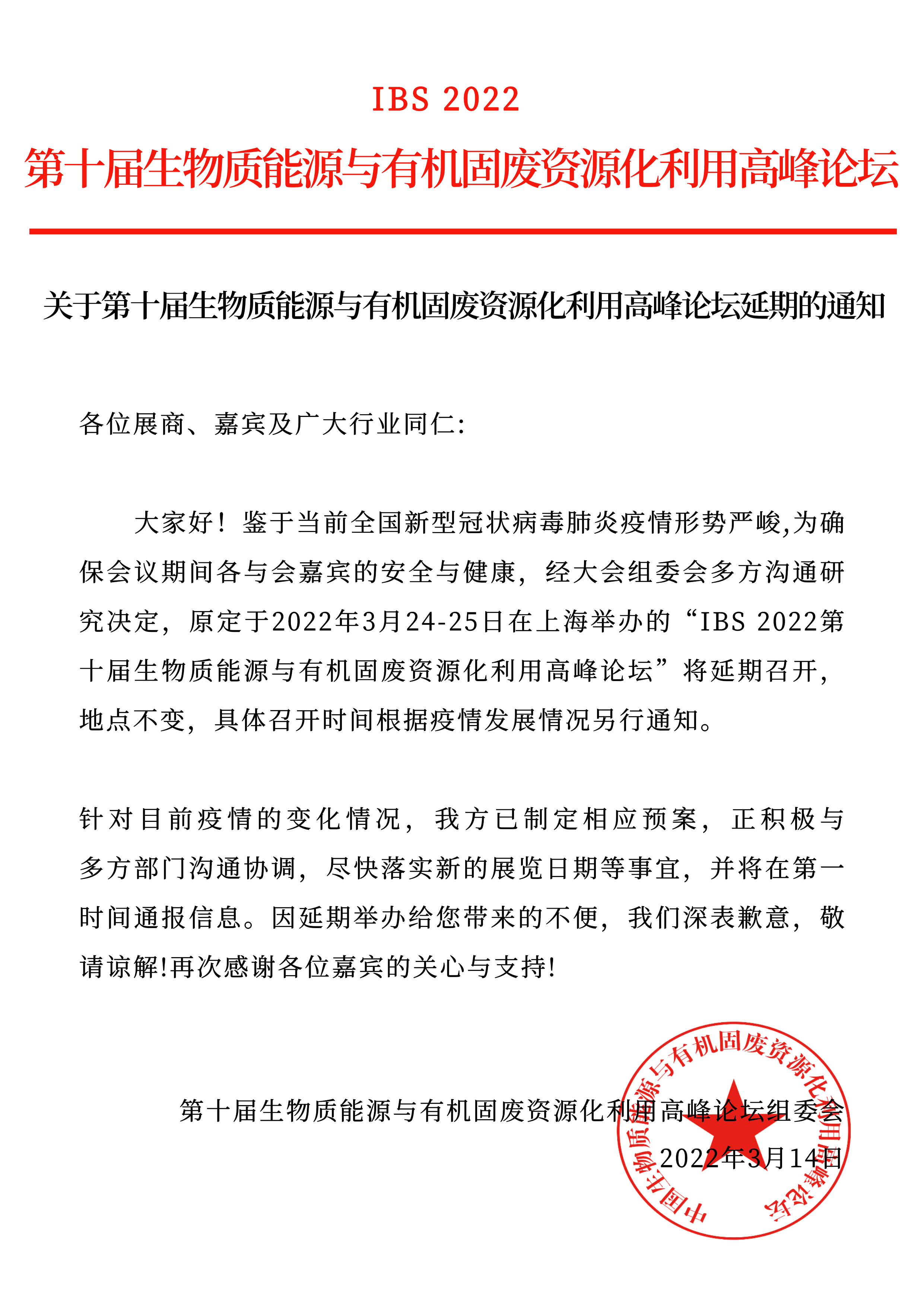 3月14日,IBS2022組委會(huì)再次發(fā)布通知,原定于2022年3月24-25日在上海舉辦的“IBS 2022第十屆生物質(zhì)能源與有機(jī)固廢資源化利用高峰論壇”將延期召開(kāi),地點(diǎn)不變,具體召開(kāi)時(shí)間根據(jù)疫情發(fā)展情況另行通知。