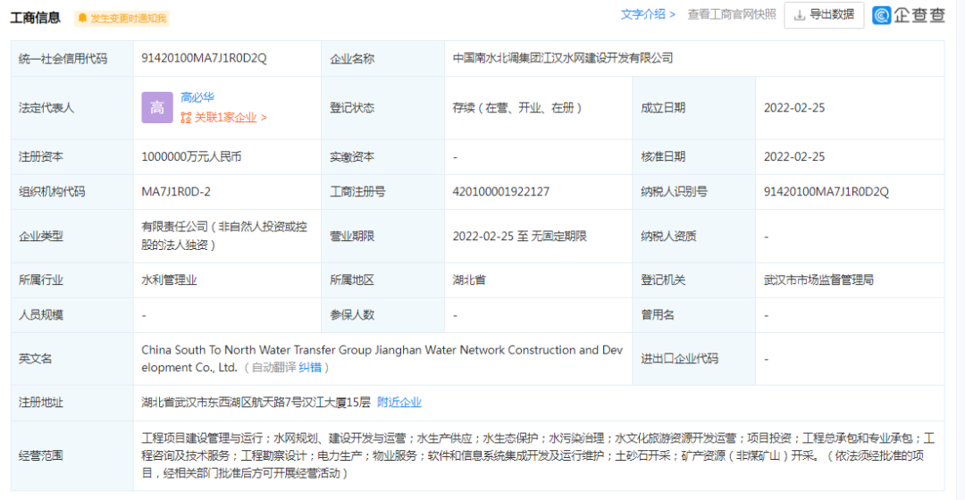 據(jù)企查查顯示,中國南水北調(diào)集團(tuán)江漢水網(wǎng)建設(shè)開發(fā)有限公司法人為高必華。