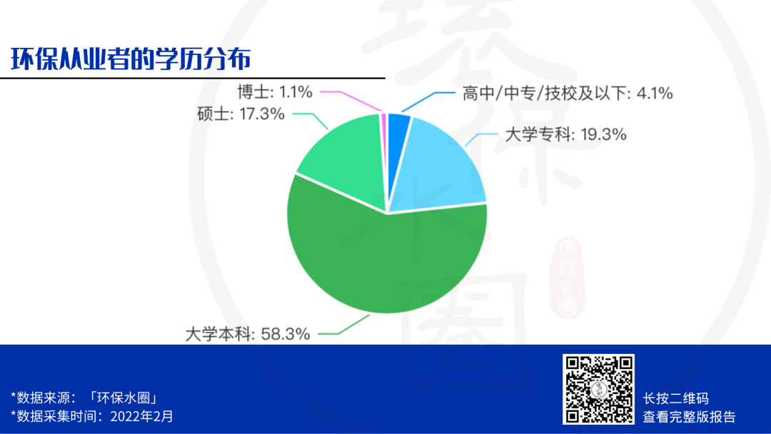 從上圖可以看出,大部分環(huán)保人為本科學(xué)歷,占總體的58.3%。碩士學(xué)歷的環(huán)保人占17.3%,博士學(xué)歷的占1.1%。另外,??频绕渌麑W(xué)歷的環(huán)保人占比總體的 23.4%。從數(shù)據(jù)來看,多數(shù)從業(yè)者屬于中高學(xué)歷群體,可謂是環(huán)保行業(yè)的中流砥柱。
