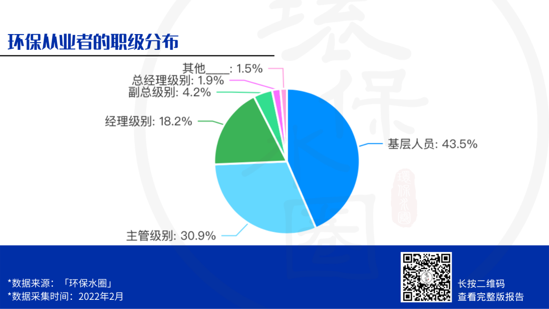 我們對環(huán)保從業(yè)者的崗位級(jí)別進(jìn)行了調(diào)查,有43.5%的環(huán)保人屬于基層人員,主管級(jí)別的小伙伴占30.9%,經(jīng)理級(jí)別占18.2%。