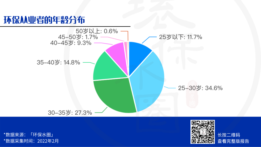 從上圖中我們可以看到,25-30 歲的環(huán)保人占比高達(dá)34.6%,30-35歲的環(huán)保人占比高達(dá)27.3%,35-40歲的環(huán)保人排進(jìn)前三占比14.8%,這三個(gè)年齡段的小伙伴成為了環(huán)保行業(yè)的中堅(jiān)力量。