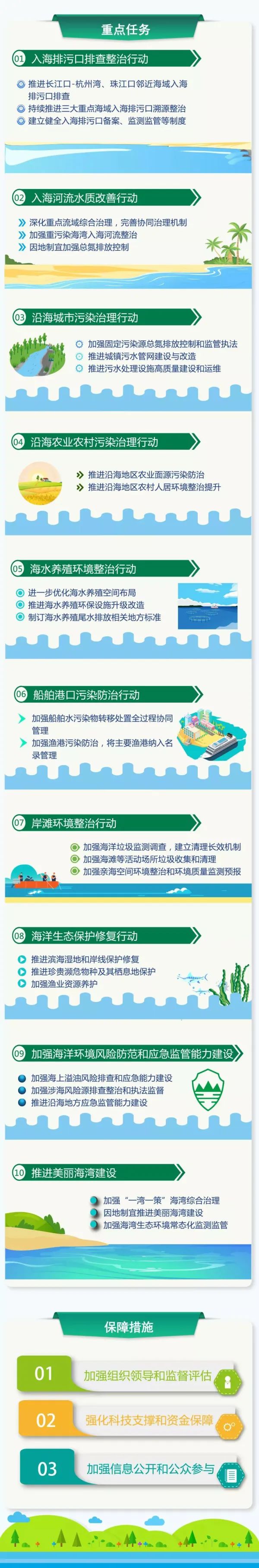 《重點(diǎn)海域綜合治理攻堅戰(zhàn)行動方案》提出開展:入海排污口排查整治行動、入海河流水質(zhì)改善行動、沿海城市污染治理行動、沿海農(nóng)業(yè)農(nóng)村污染治理行動、海水養(yǎng)殖環(huán)境整治行動、船舶港口污染防治行動、岸灘環(huán)境整治行動、海洋生態(tài)保護(hù)修復(fù)行動等“七大行動”。