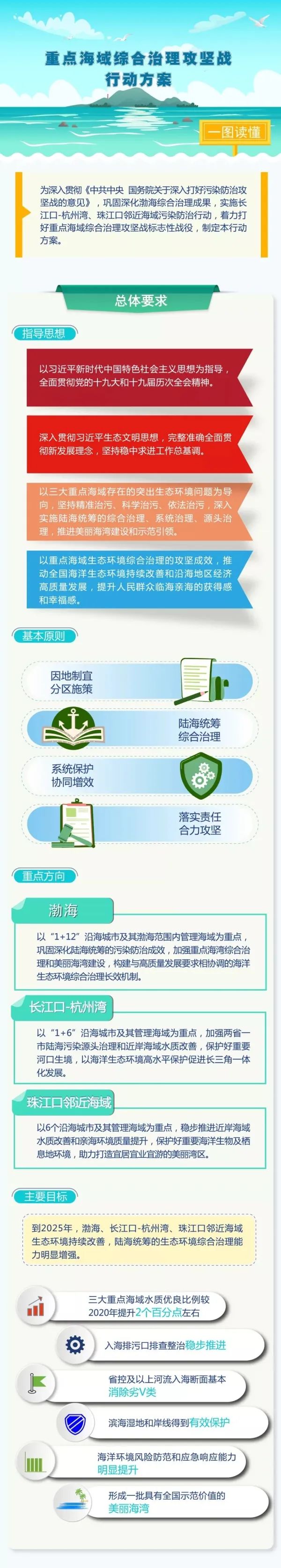 《行動方案》提出,按照因地制宜、分區(qū)施策,陸海統(tǒng)籌、綜合治理,系統(tǒng)保護(hù)、協(xié)同增效,落實(shí)責(zé)任、合力攻堅的基本原則,深入打好重點(diǎn)海域綜合治理攻堅戰(zhàn),實(shí)現(xiàn)“十四五”時期三大重點(diǎn)海域生態(tài)環(huán)境持續(xù)改善、陸海統(tǒng)籌的生態(tài)環(huán)境綜合治理能力明顯增強(qiáng)、人民群眾臨海親海的獲得感和幸福感不斷提升。