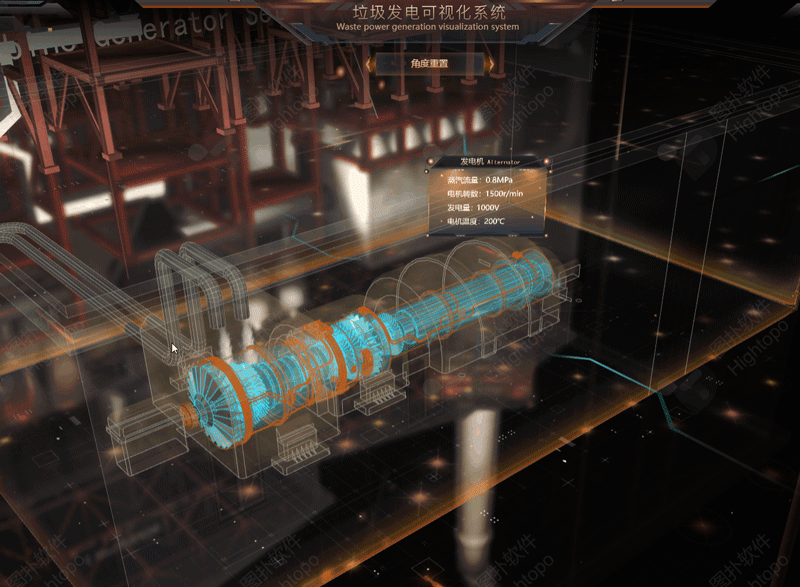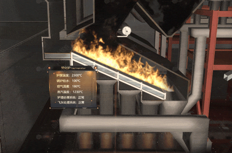 垃圾焚燒系統(tǒng)完全燃燒所產(chǎn)生的熱能經(jīng)余熱鍋爐轉(zhuǎn)化為蒸汽,再由蒸汽輪機(jī)發(fā)電機(jī)轉(zhuǎn)化為電能,從而完成一系列的能量轉(zhuǎn)換。系統(tǒng)結(jié)合 5G 通信系統(tǒng),全方面支持對(duì)鍋爐燃燒數(shù)據(jù)可視分析。通過(guò) 3D 模型形象呈現(xiàn)發(fā)電機(jī)外部結(jié)構(gòu)和工作狀態(tài);蒸汽流量、電機(jī)轉(zhuǎn)數(shù)、發(fā)電量、電機(jī)溫度等顯示在 2D 面板,自動(dòng)播放。