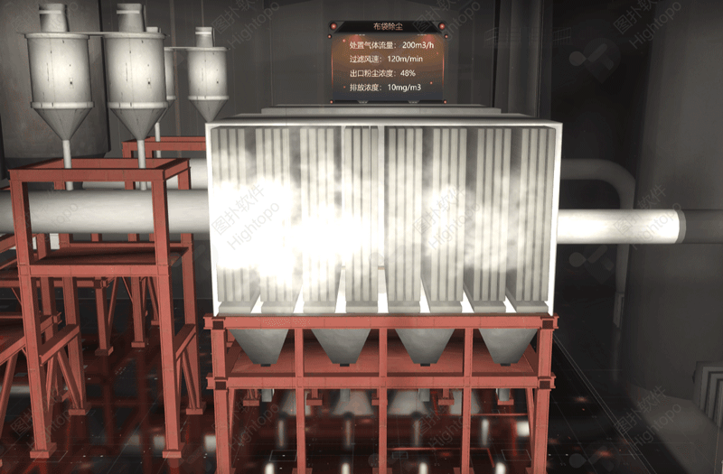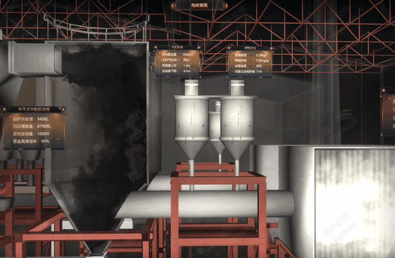 煙氣凈化系統(tǒng)是組合了半干式反應(yīng)塔、活性炭定量裝置、布袋式除塵器這三個(gè)步驟的系統(tǒng)。HT 通過(guò)對(duì)垃圾在焚燒所產(chǎn)生的煙氣、煙氣處理系統(tǒng)、凈化后通過(guò)煙囪排入大氣等過(guò)程對(duì)煙氣進(jìn)行虛擬仿真,在場(chǎng)景內(nèi)模擬煙氣凈化過(guò)程。煙氣經(jīng)過(guò)余熱鍋爐放出熱量后進(jìn)入噴霧吸收反應(yīng)塔。