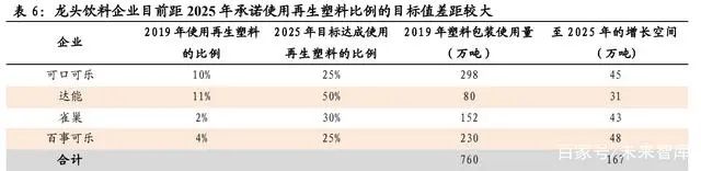 全球前四的飲料企業(yè)在新塑料經(jīng)濟(jì)承諾中設(shè)立 2025 年使用再生塑 料的目標(biāo)比例均為 25%以上。然而,據(jù)艾倫麥克阿瑟基金會(huì)統(tǒng)計(jì), 2019 年四家全球龍頭飲料企業(yè)實(shí)際使用再生塑料占塑料包裝總量 比例的均值低于 10%。如飲料行業(yè)維持目前穩(wěn)定的年銷售額,四家 龍頭企業(yè)至 2025 年存在 167 萬噸/年的再生塑料產(chǎn)能需求。