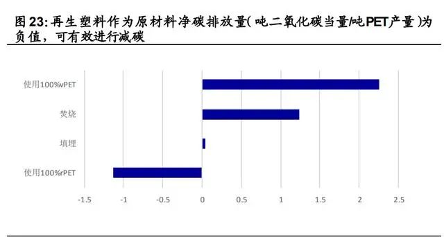 從能耗及碳排放的角度來說,再生塑料比起原生塑料來說顯著的節(jié)能減碳。以 PE 為例:1)每噸再生 PET 可減碳 1.13 噸。美國環(huán)保署(US EPA)對(duì)比了焚燒、填埋以及回收 PET 的全生命周期凈碳排 放量,回收再利用是三種終端處理方式中唯一可進(jìn)行減碳的模式。美國 EPA 將使用 100%vPET 以及使用 100%rPET 作為原材料的產(chǎn) 品進(jìn)行對(duì)比,認(rèn)為利用 rPET 作為原材料可以有效減少化石原料使 用,每噸再生 PET 可減少 1.13 噸二氧化碳當(dāng)量排放。2)再生塑料 有效減碳創(chuàng)造新的工藝需求。根據(jù)百事亞洲研發(fā)中心,我國 2019 年 PET 瓶消耗量為 442 萬噸,假定保持 94%的高回收率,經(jīng) 4 次循環(huán), PET 瓶可每年抵減 2427 萬噸二氧化碳當(dāng)量排放。PET 瓶到瓶再生 利用可助力我國實(shí)現(xiàn)碳中和政策。