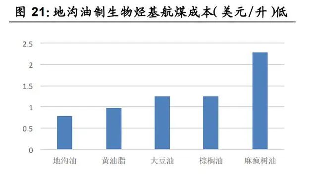 再生地溝油產(chǎn)品附加值將逐步提升,產(chǎn)業(yè)升級(jí)良機(jī)將至。受到成本和隱含碳稅影響,目前海外的生物質(zhì)航煤價(jià)格遠(yuǎn)高于化石航煤,生 物質(zhì)航煤的需求基本都是受到政策驅(qū)動(dòng)。據(jù) Argus media 統(tǒng)計(jì),2020 年生物質(zhì)航煤價(jià)格為化石航煤的 3-6 倍。地溝油制生物質(zhì)航煤產(chǎn)品 附加值將較 UCOME 顯著提升,再生地溝油向著高端產(chǎn)品升級(jí)的產(chǎn) 業(yè)趨勢明顯。