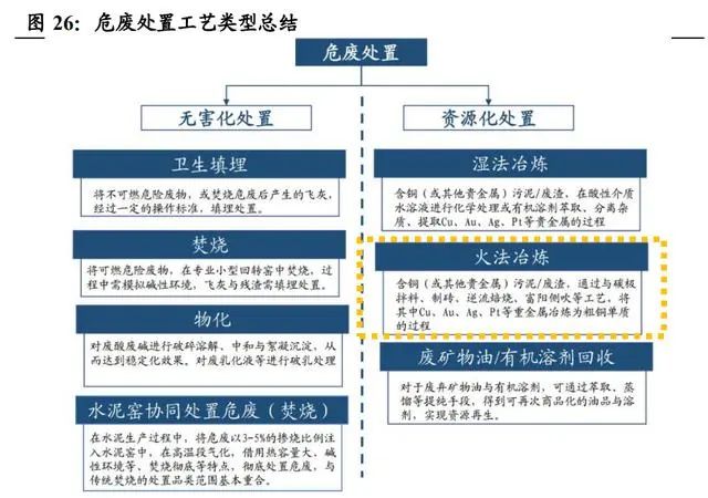危廢處置技術(shù)可分為無害化和資源化。1)危廢是工業(yè)生產(chǎn)過程中產(chǎn)生的 危險(xiǎn)廢棄物,我國對(duì)危廢界定嚴(yán)格執(zhí)行名錄管理制度,并執(zhí)行全生命周 期管理。2)根據(jù) 2021 年版國家危險(xiǎn)廢物名錄,危廢分為 46 大類 467 小 類,不同種類的危廢處置手段有所區(qū)別。由于危廢本身的污染物屬性和 資源屬性,處置技術(shù)可分無害化及資源化:①無害化:當(dāng)污染物屬性占 主要地位時(shí),以無害化處置為主,通過焚燒、填埋、物化等方式,進(jìn)行 減量、徹底的性狀改變或與環(huán)境徹底隔離等方式避免環(huán)境危害;②資源 化:當(dāng)資源屬性占主要地位時(shí),以資源化回收再利用處置為主,通過有 價(jià)組分回收、提純回用等方式,顯著降低廢物的環(huán)境危害,同時(shí)獲得盈 利。