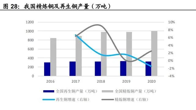 對(duì)標(biāo)發(fā)達(dá)國家,我國再生金屬利用率有待提升。同樣以火法資源化 典型產(chǎn)品再生銅為例,1)2021年我國精煉銅產(chǎn)量同比增長 7%達(dá) 1049 萬噸,根據(jù) SMM,2021 年用于生產(chǎn)電解銅的再生銅原料占比 約為 21%,與發(fā)達(dá)國家平均 64%的比例相比仍差距較大(WBMS, 2016)。2)根據(jù)《“十四五”循環(huán)經(jīng)濟(jì)發(fā)展規(guī)劃》,2020 年我國再生 銅產(chǎn)量 325 萬噸,到 2025 年再生銅產(chǎn)量將達(dá) 400 萬噸。3)預(yù)計(jì)未 來碳排放約束將持續(xù)提升我國再生銅利用比例。