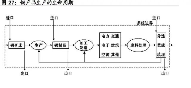 從銅產(chǎn)品生產(chǎn)的生命周期來看,研究碳排放的系統(tǒng)邊界包括開采、 冶煉、再生產(chǎn)、加工以及進(jìn)出口銅。