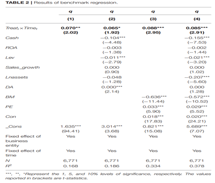 基準回歸結果如下表所示,由回歸結果可知,無論是否加入控制變量,核心解釋變量的系數均顯著為正,表明綠色金融試點政策顯著提升了試點地區(qū)綠色企業(yè)的長期價值。