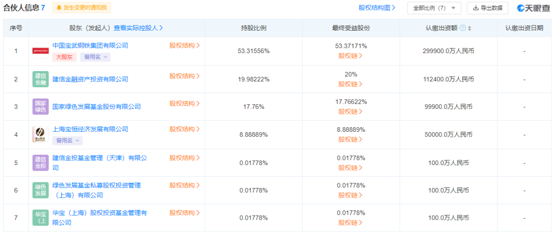 天眼查工商信息顯示,該基金由中國(guó)寶武鋼鐵集團(tuán)有限公司出資29.99億;建信金融資產(chǎn)投資有限公司出資11.24億;國(guó)家綠色發(fā)展基金股份有限公司出資9.99億元;上海寶恒經(jīng)濟(jì)發(fā)展有限公司出資5億元;建信金投基金管理(天津)有限公司、綠色發(fā)展基金私募股權(quán)投資管理(上海)有限公司、華寶(上海)股權(quán)投資基金管理有限公司各出資100萬(wàn)元。