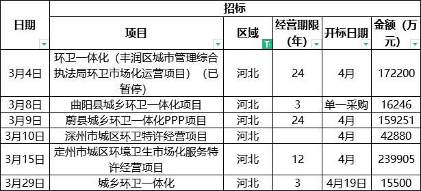 一季度末尾給二季度開了一個(gè)好彩頭,雖然3月份只開標(biāo)了18個(gè)億級(jí)環(huán)衛(wèi)項(xiàng)目,但卻有23個(gè)過(guò)億項(xiàng)目開始招標(biāo),而且這些項(xiàng)目均在4月份開標(biāo),總投資達(dá)138億!這也意味著第二季度首月已有百億項(xiàng)目將被收入囊中。