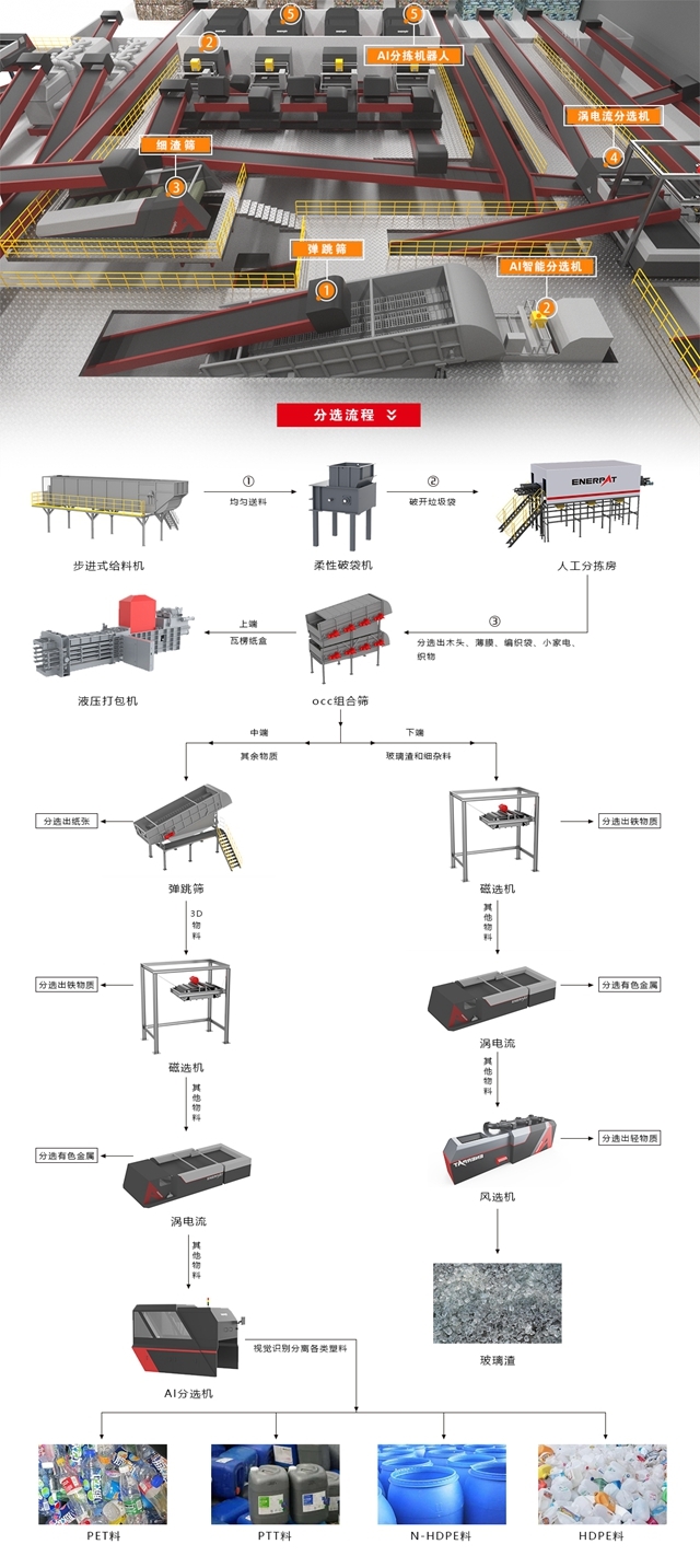 一圖向你闡述高科技的魅力,源頭分類精準(zhǔn)度不高、先分后混、人工分揀難度大、成本高、配套基建水平落后,恩派特為這些問題找到了一條千河入海的同一路徑——由步進(jìn)式給料機(jī)、柔性破袋機(jī)、OCC組合篩、AI智能分選機(jī)、彈跳篩、渦電流分選機(jī)、磁選機(jī)、風(fēng)選機(jī)、2D/3D分選機(jī)、AI分揀機(jī)器人等強(qiáng)強(qiáng)組合的高智能化自動(dòng)分揀流水線。