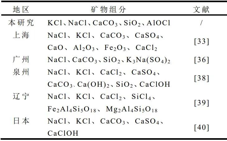與不同地區(qū)飛灰礦物相組分對比,由表3可知,不同地區(qū)飛灰均含有碳酸鹽和硅酸鹽,且含有NaCl、KCl等可溶性氯鹽,Na、K元素來源于餐飲中食鹽等調(diào)味料的添加,高含量Cl-來源于爐排爐高溫焚燒下無機(jī)氯鹽的揮發(fā)以及垃圾成分中的廚余垃圾、塑料制品。相較于其他地區(qū),本研究還檢測到不溶氯AlOCl組分,可能是由于飛灰中Al2O3與焚燒煙氣中的酸性氣體反應(yīng)生成。