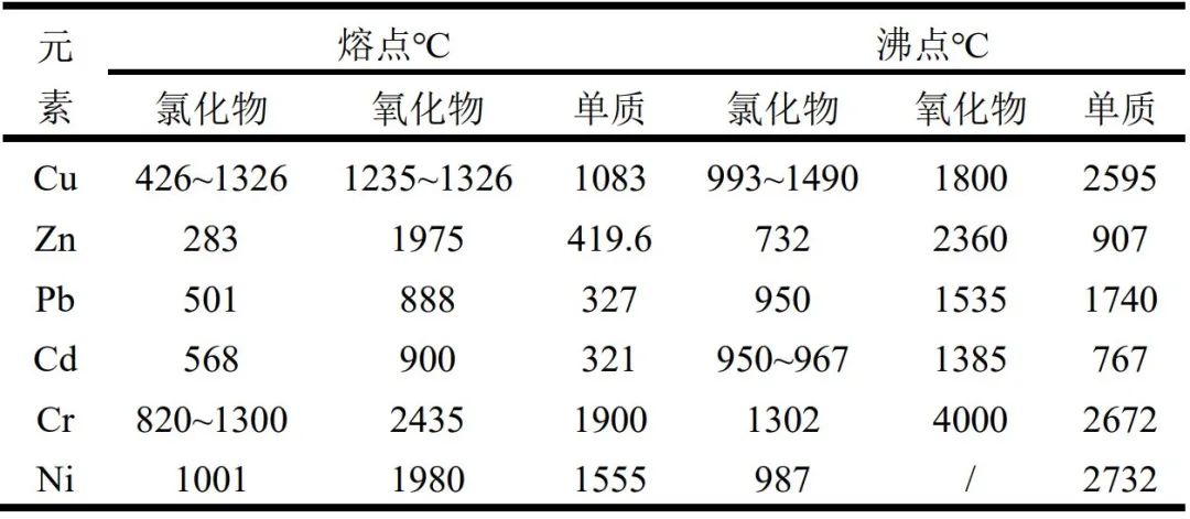 表2 飛灰中重金屬不同存在形態(tài)及其熔沸點(diǎn)