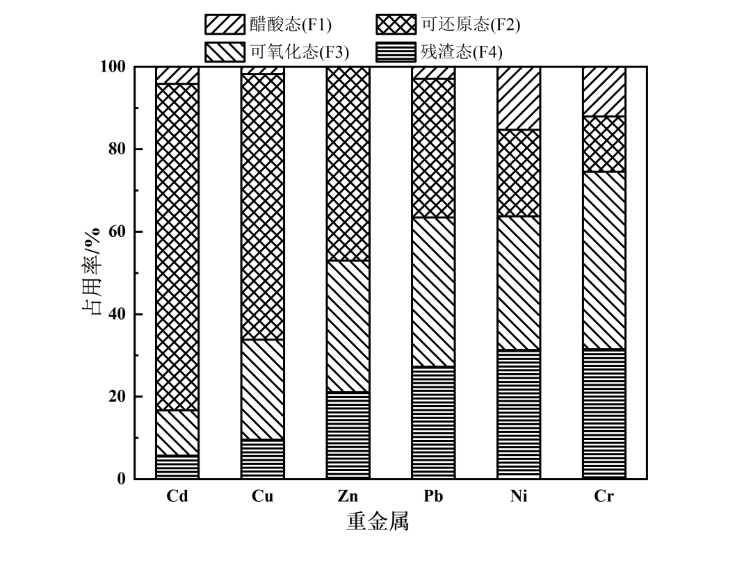 重金屬的生物有效性及潛在遷移性不僅與其總量有關(guān),還與其在飛灰中的賦存形態(tài)密切相關(guān),按照BCR分級(jí)提取法對焚燒飛灰中不同形態(tài)重金屬進(jìn)行提取測定。BCR四步連續(xù)提取法將重金屬分為F1態(tài),主要含有水溶態(tài)、可交換態(tài)和碳酸鹽結(jié)合態(tài),在中性或弱酸性條件下易浸出;F2態(tài)主要是鐵錳氧化物結(jié)合態(tài),高活性的鐵錳氧化物比表面積大,對金屬離子有較大吸附容量,在還原條件下較易釋放;F3態(tài)包括有機(jī)物與硫化物結(jié)合態(tài),這一過程提取出來的重金屬,是被有機(jī)物或硫化物絡(luò)合的部分,在強(qiáng)氧化條件下可分解;F4態(tài)中元素主要與硅酸鹽礦物組合,在自然條件下性能穩(wěn)定,環(huán)境生態(tài)風(fēng)險(xiǎn)較小。本研究飛灰中重金屬的不同賦存形態(tài)所占百分比如圖1所示。