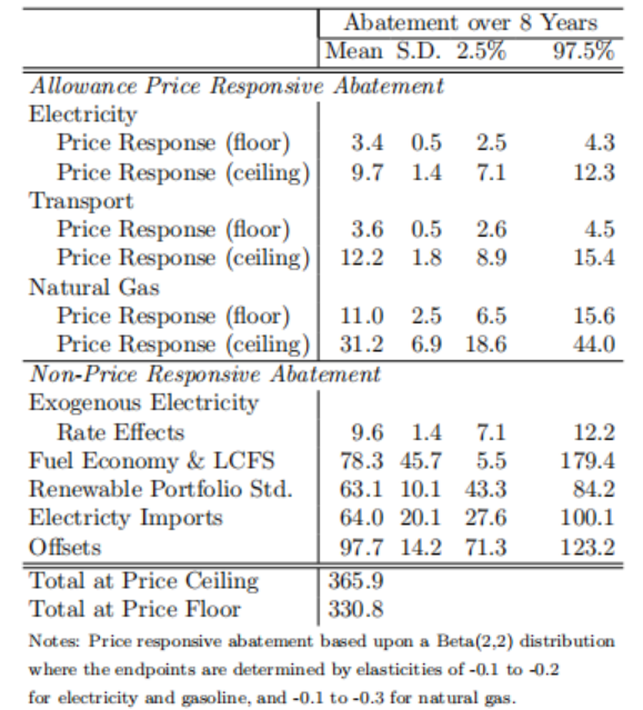 相對于價格因素而言,非市場因素對溫室氣體減排的貢獻(xiàn)較大。表1為2013-2020年減排供給量的估計值,該表下半部分的非市場因素,如清潔發(fā)電計劃、能效提升政策、清潔燃油政策等環(huán)境政策的減排量(Price Non-Responsive Abatement),明顯高于表上半部分的電力、燃油和天然氣等價格因素所產(chǎn)生的減排量(Allowance Price Responsive Abatement)。