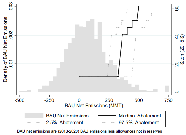 如圖2所示,通過分析減排需求和減排供給的估計值,文章發(fā)現(xiàn)市場出清時,溫室氣體交易的價格有94.8%的概率處于或者接近價格下限即拍賣底價(Auction Reserve Price,ARP)。這意味著相對于估計得到的BAU排放量,排放配額的設(shè)定過高,此時經(jīng)濟(jì)主體通過非市場因素的配套政策即可完成溫室氣體減排約束,無需在交易市場上高價購買排放配額。價格處于“內(nèi)部均衡”,即均衡價格高于價格下限ARP但低于價格上限(Allowance Price Containment Reserve,APCR)的概率為1.2%,此時溫室氣體排放的價格彈性較高,配額交易市場的減排有效性達(dá)到最優(yōu)狀態(tài)。