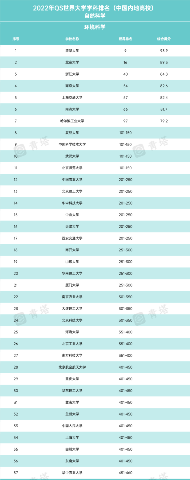 范圍縮小到內(nèi)地高校,按照2022年QS世界大學學科排名,中國內(nèi)地高校環(huán)境科學學科排名如下: