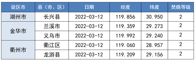 浙江省生態(tài)環(huán)境監(jiān)測中心基于TERRA/MODIS(上午)和AQUA/MODIS(下午)衛(wèi)星遙感數(shù)據(jù),2022年3月,共監(jiān)測到秸稈焚燒火點5個(不包括云覆蓋下的火點信息),同比減少1個,所屬轄區(qū)為湖州市、金華市和衢州市,其余設(shè)區(qū)市未監(jiān)測到火點。