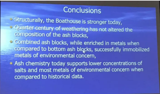 這位教授的演講題目很有趣,叫“船屋”。他講述了自己在年輕時(shí)候從垃圾焚燒廠弄回來一些垃圾灰制成的磚,用這些磚制作了一個(gè)小房間,這個(gè)小房間是用于存放他出去游玩的一艘小船的。為了檢驗(yàn)這些垃圾灰是否對人存在傷害,在這個(gè)幾十年中間,這位老教授會定期從墻上取樣分析這些灰的成分變化,并將這些數(shù)據(jù)展現(xiàn)在我們面前。