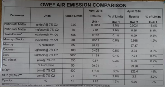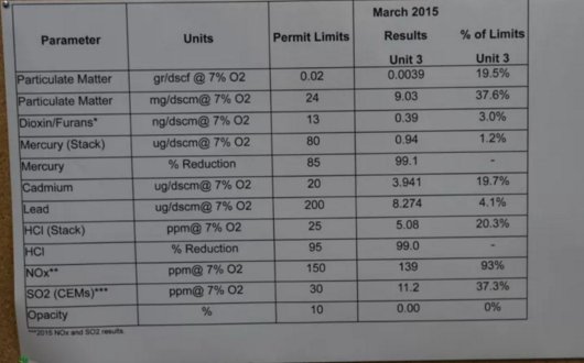 會議之后,我們開始陸續(xù)走訪工廠,第一個(gè)是美國明尼阿波利斯—Olmsted焚燒廠,該廠為2x100t/d+1x200t/d的規(guī)模,煙氣工藝采用的是固定噴霧法+布袋除塵器。全廠排放情況尚可,具體如下: