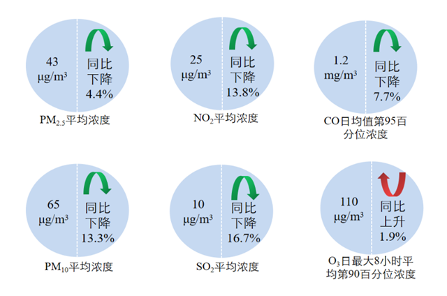 1—3月,全國(guó)339個(gè)地級(jí)及以上城市平均優(yōu)良天數(shù)比例為83.8%,同比上升2.9個(gè)百分點(diǎn);PM2.5平均濃度為43微克/立方米,同比下降4.4%;PM10平均濃度為65微克/立方米,同比下降13.3%;O3平均濃度為110微克/立方米,同比上升1.9%;SO2平均濃度為10微克/立方米,同比下降16.7%;NO2平均濃度為25微克/立方米,同比下降13.8%;CO平均濃度為1.2毫克/立方米,同比下降7.7%。