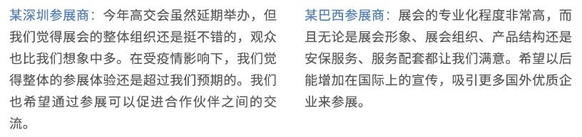 作為疫情防控常態(tài)化下舉辦的科技盛會,2021年高交會總面積達15.85萬平方米,線下11個、線上26個國家和國際組織,共56個團組參展本屆高交會。天津、山東等9家省市展團,清華大學、北京大學等14所高校團組精心組織眾多科研成果進行展示,經(jīng)專家評審,120家單位獲優(yōu)秀組織獎,81家單位獲優(yōu)秀展示獎,599個項目獲優(yōu)秀產(chǎn)品獎,共有4164家展商亮相線下展會和線上展會,共舉辦各類高層次論壇、專業(yè)技術(shù)論壇、行業(yè)沙龍等活動73場,近15萬人次觀眾現(xiàn)場參觀了大會,有129家海內(nèi)外媒體的超過500多名記者參與了本屆高交會的報道。大會委托的第三方調(diào)研公司對第二十三屆高交會參展商的現(xiàn)場調(diào)查數(shù)據(jù)(見下圖)。