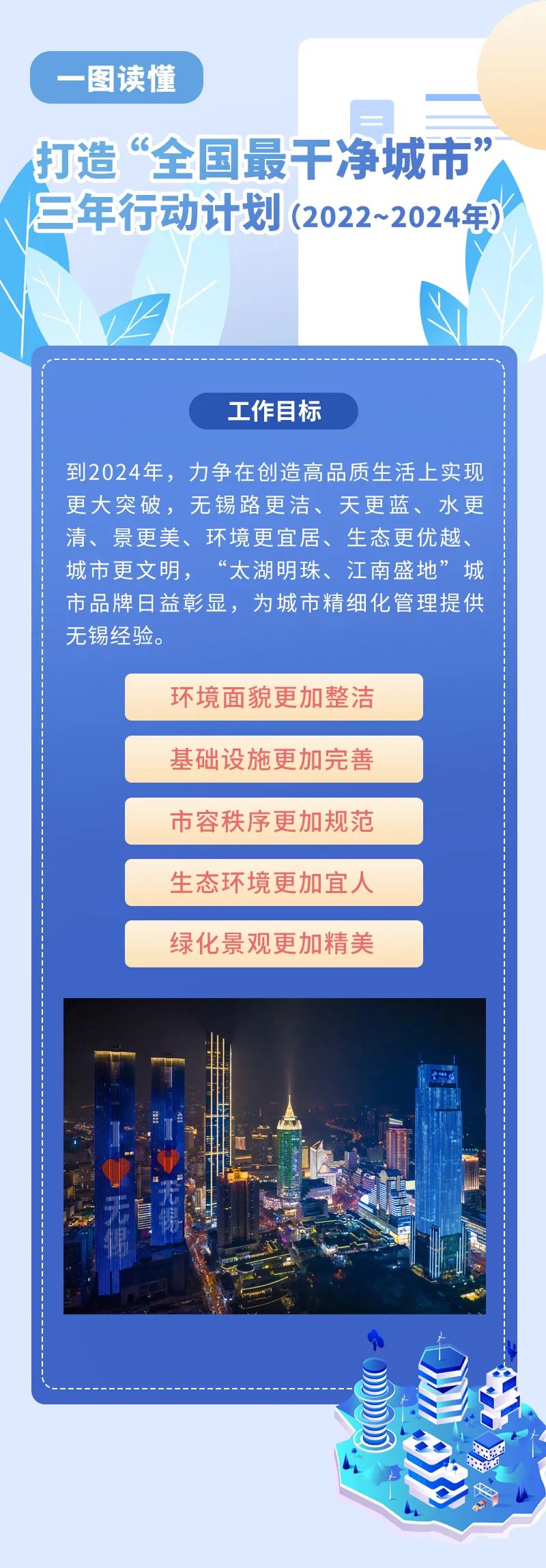 2020年9月,無錫首次提出了打造“全國最干凈城市”。全國部分城市也曾提過類似概念,但很多停留在市容整潔的層面上。市委、市政府提出打造“全國最干凈城市”目標,絕不是突發(fā)奇想,而是基于對無錫城市能級的總體考量、對城市規(guī)模的理性認識、對城市管理現狀的準確把握,無錫應當也可以朝著“全國最干凈城市”方向努力。一座城市,三分靠建設、七分靠管理,而城市管理,不僅講技術,還要講藝術。根據過往幾年治理經驗的整合優(yōu)化,無錫市發(fā)布了打造“全國最干凈城市”三年行動計劃。可以說,“無錫版本”領域更廣闊、要素更充實、指標更多樣,實施過程中還會根據實際需求進行動態(tài)調整。 打造“全國最干凈城市”,無錫提出了5個方面的目標。
