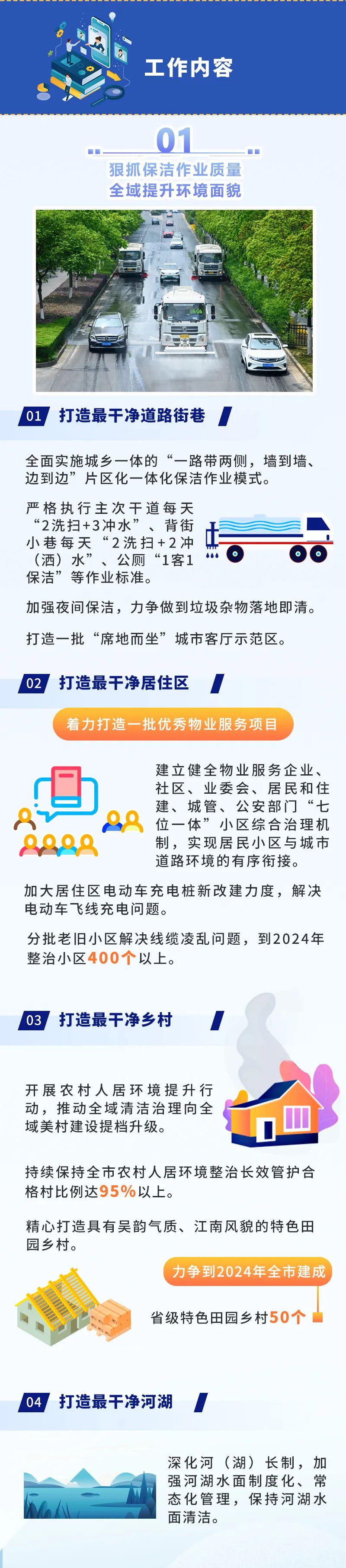 ●環(huán)境面貌更加整潔。到2024年,全市主次干道潔凈度100%、背街小巷潔凈度90%、河湖水面潔凈度100%、綠化區(qū)域潔凈度100%、小區(qū)環(huán)境潔凈度90%,打造“席地而坐”城市客廳示范區(qū)100個。●基礎設施更加完善。2000年底前建成的老舊小區(qū)改造率100%,完成街巷(街區(qū))品質提升改造項目100個,建成區(qū)一類環(huán)衛(wèi)公廁比例25%;基礎設施管養(yǎng)到位,主要道路黑色化、標線本色化95%,人行道板完好率95%,路燈設施亮燈率99%,戶外廣告設施整潔完好率95%,城市家具清潔完好率98%。●市容秩序更加規(guī)范。市區(qū)道路停車泊位管理覆蓋率100%,三亂小廣告治理覆蓋率100%,市容環(huán)衛(wèi)責任區(qū)履約率100%,顯見性市容違法行為“動態(tài)清零”。●生態(tài)環(huán)境更加宜人。重污染天氣基本消除,空氣質量優(yōu)良天數比例達到82%以上,PM2.5年均濃度達到27微克/立方米;城市黑臭水體全面消除,地表水國省考斷面優(yōu)Ⅲ比例達到90%以上;土壤環(huán)境風險有效管控,重點建設用地安全利用率達到100%;固體廢棄物無害化處置率、資源化利用率達到和保持全國領先水平,城鄉(xiāng)生活垃圾分類覆蓋率100%,保持生活垃圾無害化處理率100%,生活垃圾回收利用率36%,一般工業(yè)固廢綜合利用率98%。●綠化景觀更加精美。高品質建設和改造提升城市綠化,形成有特色、有人文、生態(tài)化的景觀新風格,建成區(qū)綠化覆蓋率達到43%,人均公園綠地面積達到14.9平方米,萬人擁有綜合公園指數≥0.06,公園綠地10分鐘服務圈覆蓋率達到90%,建設城市骨干綠道100公里,建成國家生態(tài)園林城市。打造“全國最干凈城市”,不是空洞的口號、不是泛化的要求,而要體現在具體落實和實際效果上。打造可觀可感的“物之美”。全市每年完成30個街巷(街區(qū))品質提升改造項目,培育建設特色街、精品街;到2024年,主次干道空中管線入地率達30%以上;全面設計改造沿街廣告設施和店招標牌,實現共性設置與個性挖潛融合互生;對4大類45項城市家具分級分類提升改造,著力打造和諧、生態(tài)、舒適的“城市會客廳”,每年新改建和優(yōu)化提升休憩座椅2000個,使生態(tài)業(yè)態(tài)、風格風貌、家具小品等城市要素與周邊環(huán)境、人文特色相得益彰,城市亮化、城市更新、基礎設施建設等方方面面精彩紛呈,讓人情不自禁“會心一笑”。打造無所不在的“凈之美”。路面平整衛(wèi)生、干凈清爽,街區(qū)秩序井然、席地可坐,公共空間長治久潔,地下空間集約高效,垃圾分類蔚然成風,城市中的細節(jié)與質感詮釋著美好生活該有的模樣。城市干凈不干凈,“席地而坐”是一個標準。通過打造最干凈道路街巷、打造最干凈居住區(qū)、打造最干凈鄉(xiāng)村、打造最干凈河湖,建成“席地而坐”城市客廳示范區(qū)100個,實現居民小區(qū)與城市道路環(huán)境的有序銜接,使省級特色田園鄉(xiāng)村達到50個。 打造詩意棲居的“景之美”。一路一景,提升道路景觀綜合品質;一地一策,提升老舊城區(qū)綠化品質;一園一品,提升城市公園景觀品質;一岸一綠,提升河湖岸線生態(tài)品質。到2024年,全市基本完成15條濱水風景路、5條沿山風景路、13條迎賓大道的建設任務;重點整治河道水質優(yōu)Ⅲ比例達到90%以上,太湖無錫水域水質、13條主要入湖河流水質總體穩(wěn)定,打造世界級生態(tài)湖區(qū);還要進入全國生活垃圾分類評估第一檔次,打造“無廢城市”。屆時,藍天綠地、銜山抱水的“大生態(tài)”格局基本形成,春能見花、夏能見綠、秋能見果、冬能見青的公園城市觸手可及,為生活、工作在其中的市民增添更多暖意、愜意、詩意。