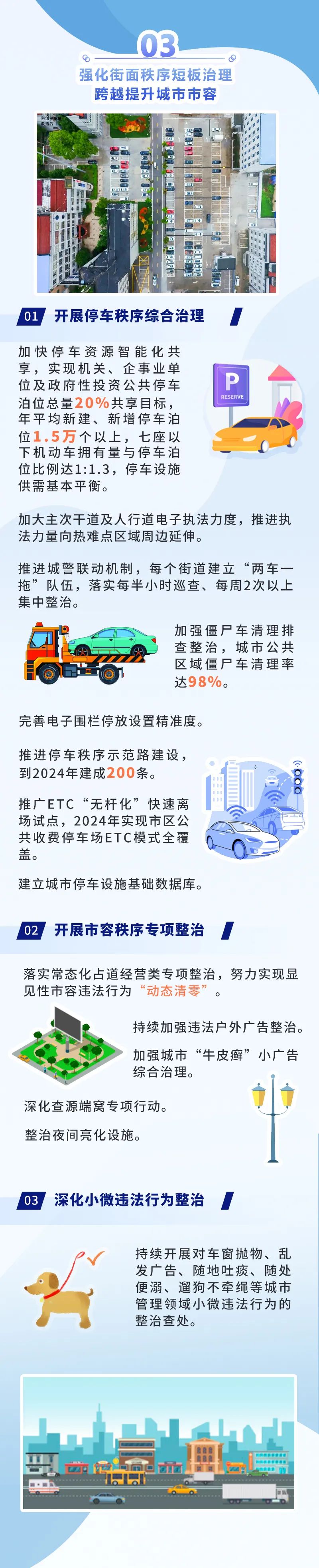 打造和諧文明的“治之美”。強化街面秩序短板治理,開展停車秩序綜合治理、市容秩序專項整治,深化小微違法行為整治,跨越提升城市市容。全市實現年平均新建、新增停車泊位1.5萬個以上,七座以下機動車擁有量與停車泊位比例達1∶1.3,停車設施供需基本平衡。實時感知、快速響應、高效處置的數字化治理模式加快構建,社會文明程度達到全國文明典范城市標準,近悅遠來、安居樂業(yè)、流連忘返、心向往之的“全國最干凈城市”成為無錫最閃亮的城市名片。 “全國最干凈城市”目標,不僅有外在干凈的形象也有內在文明的氣質,不僅關系著城市發(fā)展也影響著城市美譽度,絕不是城管局一個部門的事,也不單單是城管范疇,是一個體現城市綜合實力的概念,是一個條塊聯動、條線互動的體系。