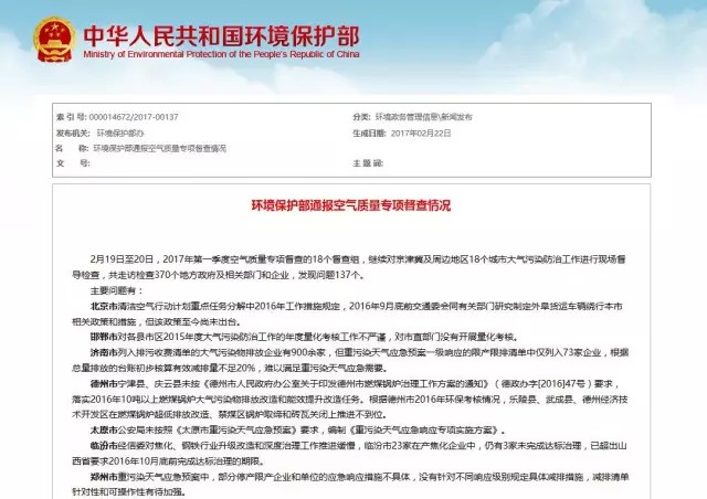 2月19日至20日,2017年第一季度空氣質(zhì)量專項(xiàng)督查的18個(gè)督查組,繼續(xù)對(duì)京津冀及周邊地區(qū)18個(gè)城市大氣污染防治工作進(jìn)行現(xiàn)場督導(dǎo)檢查,共走訪檢查370個(gè)地方政府及相關(guān)部門和企業(yè),發(fā)現(xiàn)問題137個(gè)。