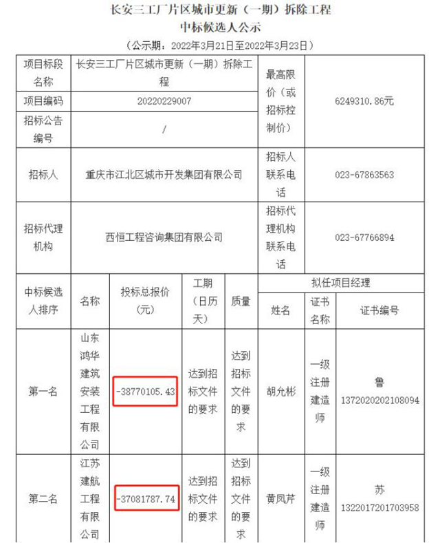 這個(gè)奇葩的案例,就是不久前發(fā)布中標(biāo)公告的重慶市長(zhǎng)安三工廠片區(qū)城市更新(一期)拆除工程項(xiàng)目。中標(biāo)人為山東鴻華建筑安裝工程有限公司(私企),中標(biāo)金額約為“-3877.01萬(wàn)元”。更有意思的是,第二中標(biāo)人和第三中標(biāo)人的報(bào)價(jià)分別為-3708.18萬(wàn)元和-3517.51萬(wàn)元,也均為負(fù)數(shù)。