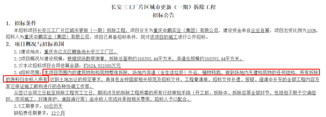 2022年2月23日,重慶中鵬實(shí)業(yè)(集團(tuán))有限公司發(fā)布了長(zhǎng)安三工廠片區(qū)城市更新(一期)拆除工程的招標(biāo)公告。招標(biāo)公告稱,拆除總面積約168393.44平方米,棄渣總規(guī)模約168393.44平方米,合同金額約為約624.931086萬(wàn)元。