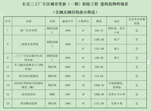 招標(biāo)文件附件中的《建構(gòu)筑物明細(xì)表》顯示,本次拆除共計(jì)26項(xiàng)內(nèi)容,幾乎全部為“新廠區(qū)冷卻塔、三工廠空壓站循環(huán)水系統(tǒng)水池、焊后儲(chǔ)運(yùn)鏈廊道”等工廠廠區(qū)構(gòu)建及附近道路。可見,本次一期拆除的范圍應(yīng)該集中在該片區(qū)的工業(yè)用地內(nèi)。