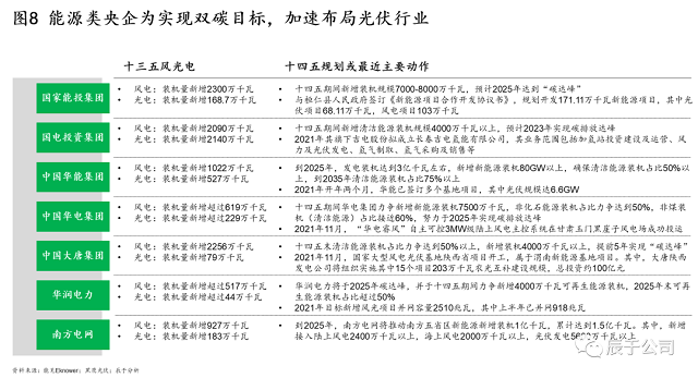值得關(guān)注的是,為實現(xiàn)碳達峰碳中和,能源類央企加速布局光伏行業(yè),目標宏大:例如國家能投集團計劃“十四五”期間新增裝機規(guī)模7000-8000萬千瓦,預(yù)計2025年實現(xiàn)碳達峰;國電投資集團則計劃“十四五”期間新增清潔能源裝機規(guī)模4000萬千瓦以上,預(yù)計2023年實現(xiàn)碳達峰(見圖8)。