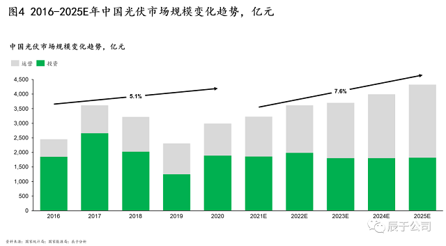 經(jīng)測算,辰于預(yù)計“十四五”期間我國光伏行業(yè)將保持7.6%的年復(fù)合增長,到2025年達到4300億元左右的市場規(guī)模,其中投資和運營分別為1800億元和2500億元左右,相比平穩(wěn)發(fā)展的光伏投資市場,運營市場增速更快(見圖4)。