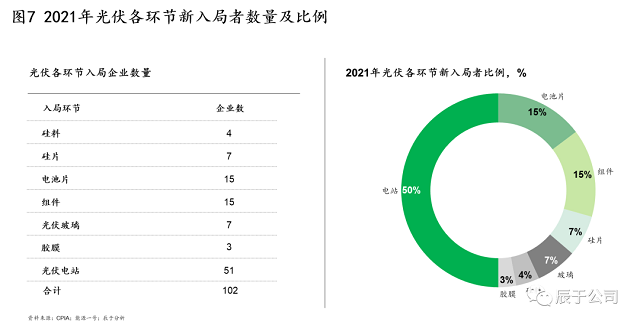 三是雙碳風口下,更多跨界進入者對光伏行業(yè)虎視眈眈。據(jù)統(tǒng)計,2021年有100多家企業(yè)新入局光伏行業(yè),涉及各環(huán)節(jié),這些企業(yè)主要分為三類,包括傳統(tǒng)光伏企業(yè)擴充業(yè)務(wù)范圍、相關(guān)企業(yè)進入(例如玻璃企業(yè))、完全跨界者,其中光伏電站、組件、電池片最受關(guān)注,新入局企業(yè)數(shù)量分別占全部的50%、15%、15%(見圖7)。