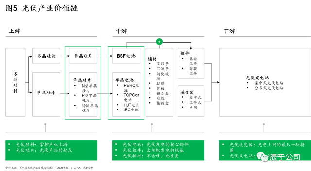 光伏細分市場多,上下游聯(lián)系緊密。從上游看,光伏硅料掌控著上游環(huán)節(jié),光伏硅片則是光伏產(chǎn)品的起點;中游的光伏電池屬于光伏發(fā)電的核心部件,光伏組件則視為光伏發(fā)電的根基;下游的光伏逆變器是光電上網(wǎng)的最后一塊拼圖,光伏發(fā)電站則是產(chǎn)業(yè)的終端(見圖5)。