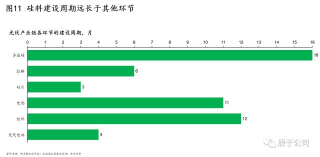 二是建設(shè)周期不同。硅料建設(shè)周期一般長達16個月,組件、電池、拉棒、光伏電站、硅片則分別為12、11、6、4、3個月,由于建設(shè)周期差異較大,供需錯配的問題時有發(fā)生(見圖11)。