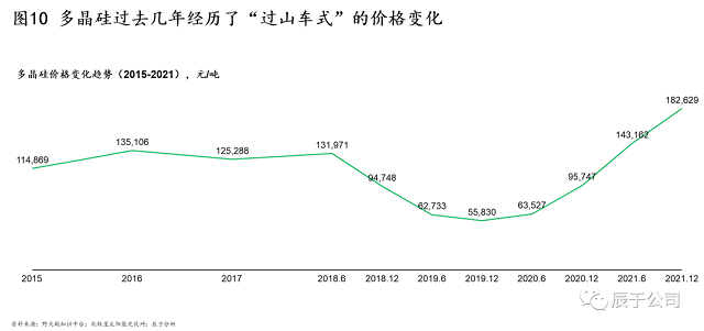 與此同時,光伏產(chǎn)業(yè)鏈上各環(huán)節(jié)的價格波動非常頻繁。以硅料為例, 2015-2018年6月,硅料價格基本維持在11-13萬元/噸的水平,然而2018年7月以后,由于嚴重的供大于求(預(yù)計硅料供給過剩規(guī)模35GW以上),硅料價格出現(xiàn)大幅下降,直至2019年12月觸及谷底5.6萬元/噸,之后隨之反彈,一路高歌猛進到2021年底達到18萬元/噸。這種過山車式的價格波動也導(dǎo)致硅料企業(yè)的盈利水平忽高忽低(見圖10)。