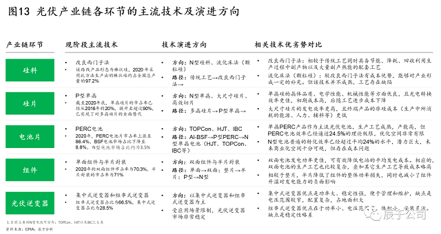 往前看,技術(shù)迭代仍在快速推進,例如硅片就剛剛經(jīng)歷過P型單晶硅片替代多晶硅片的過程,其市場占有率從2016年的20%,短短四年間就提升至2020年底的90%以上;隨之而來的是,大尺寸的N型單晶硅片的概念又被提出,由于發(fā)電效率更高、終端產(chǎn)品的非硅成本(生產(chǎn)中所消耗的能源、人力、輔料等)更低,想必又將帶來新一輪產(chǎn)品迭代風潮(見圖13)。